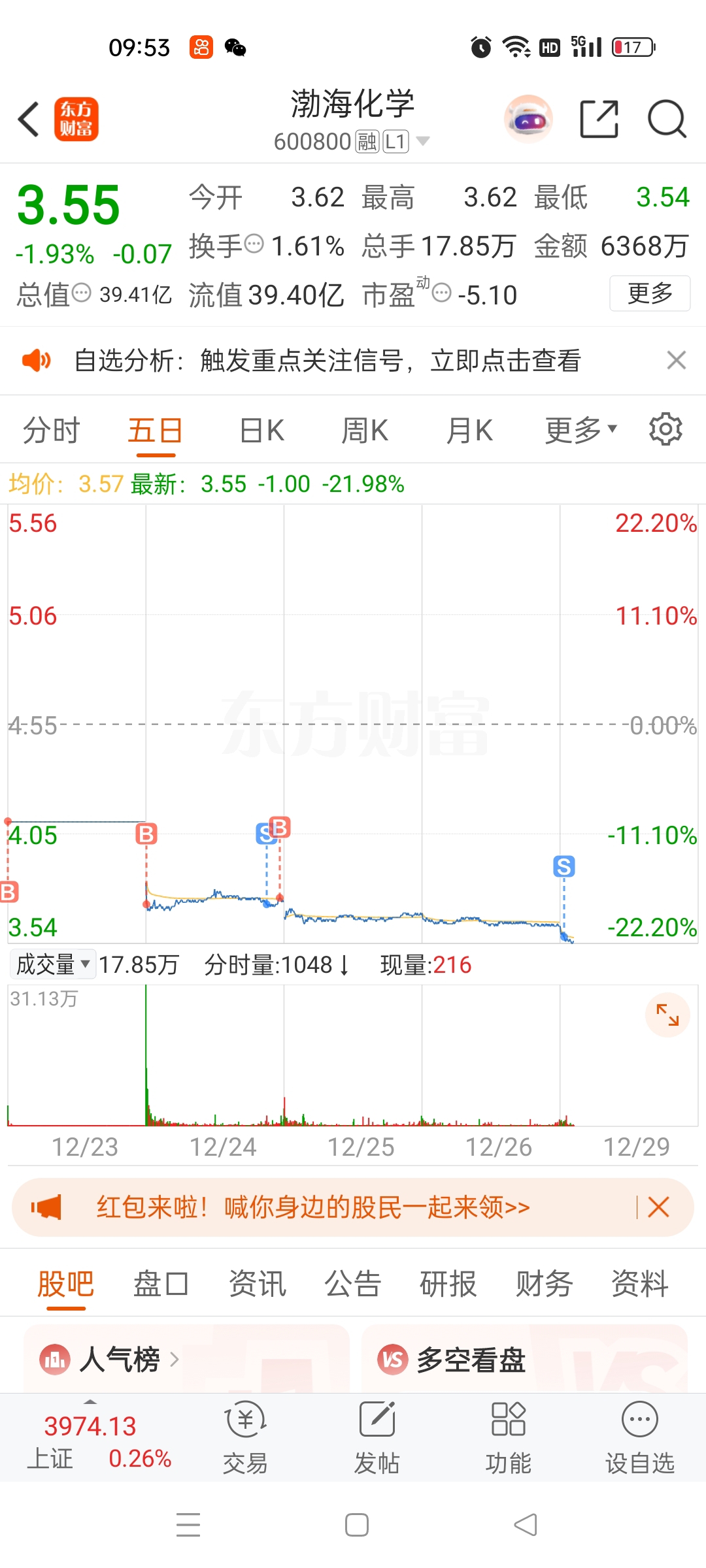 $渤海化学(SH600800)$ 算了,我还是怕了,全仓亏13个点走了