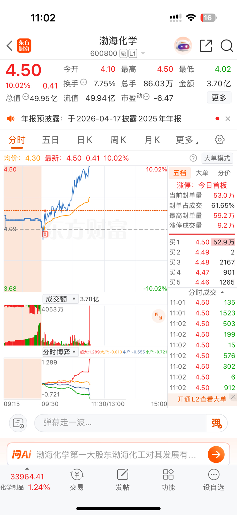 $渤海化学(SH600800)$ 今日牛骨汤