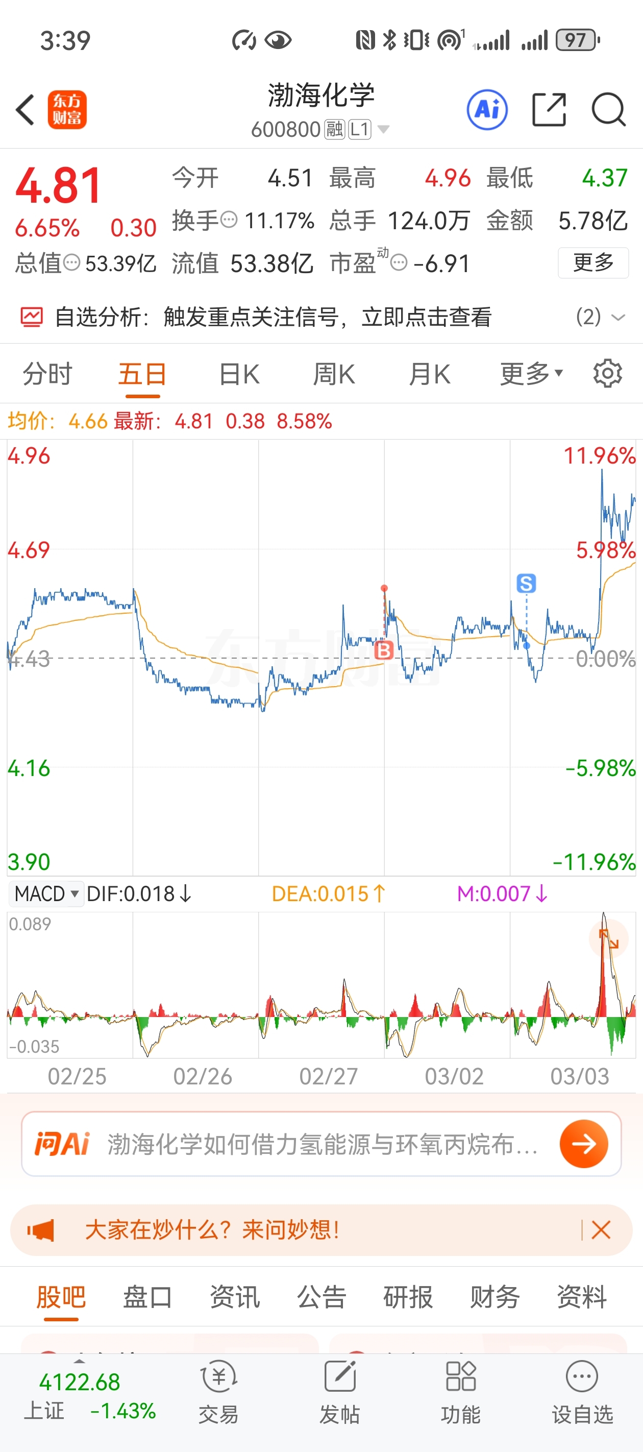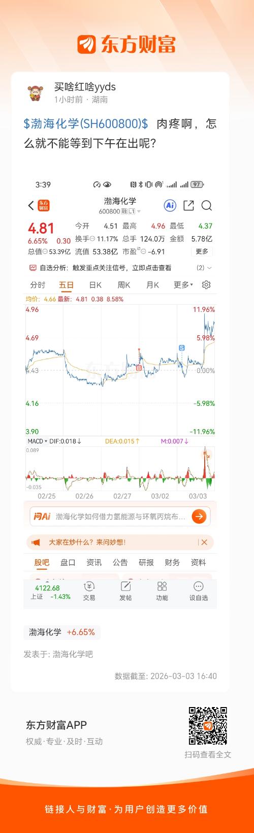$渤海化学(SH600800)$  肉疼啊,怎么就不能等到下午在出呢?