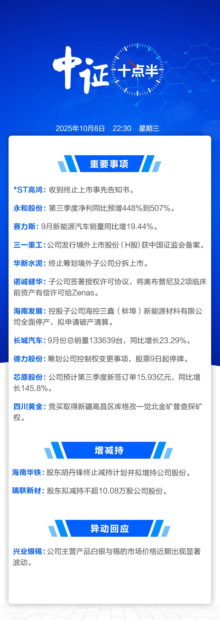 【中证十点半】华新水泥终止筹划境外子公司分拆上市;永和股份第三季度净利同比预增逾448%