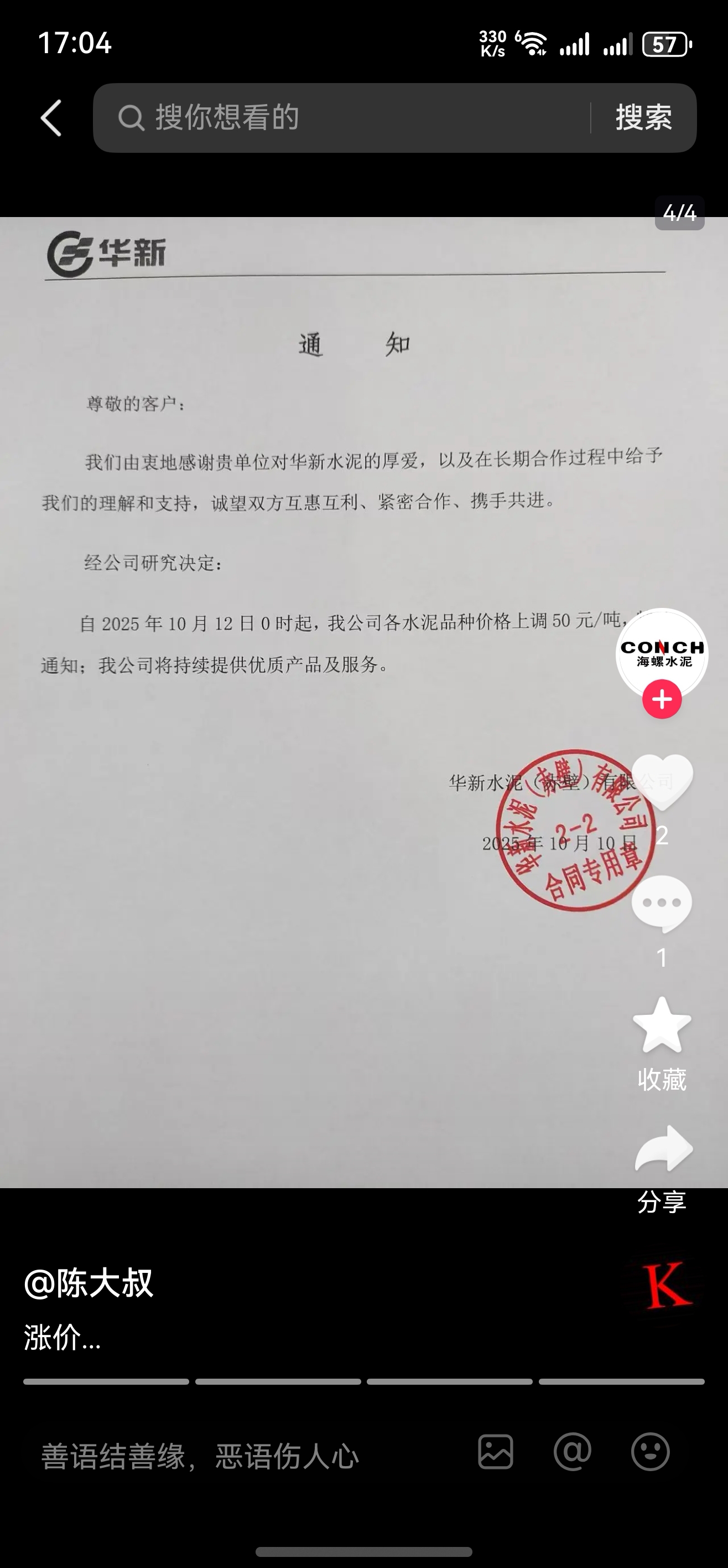 $华新水泥(SH600801)$ 水泥都在涨价了?