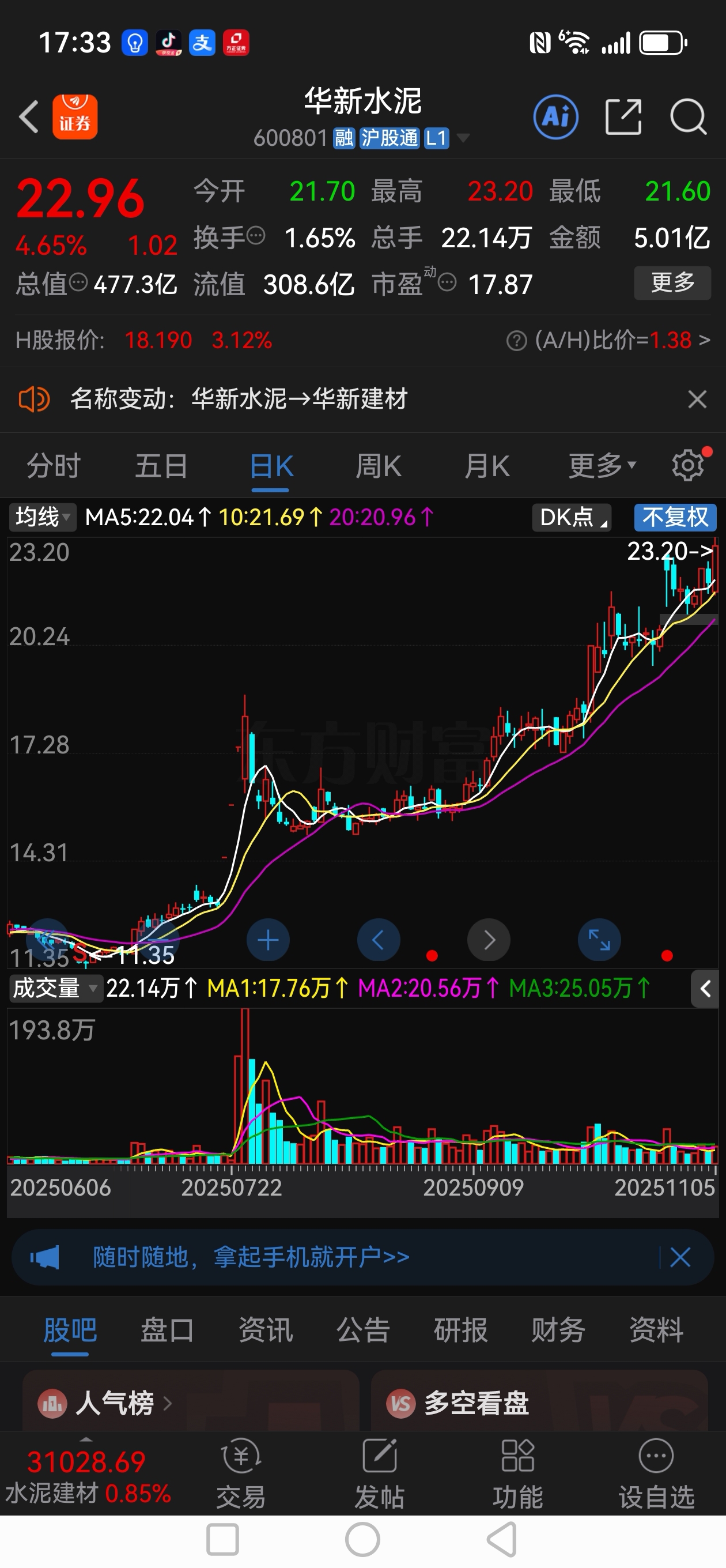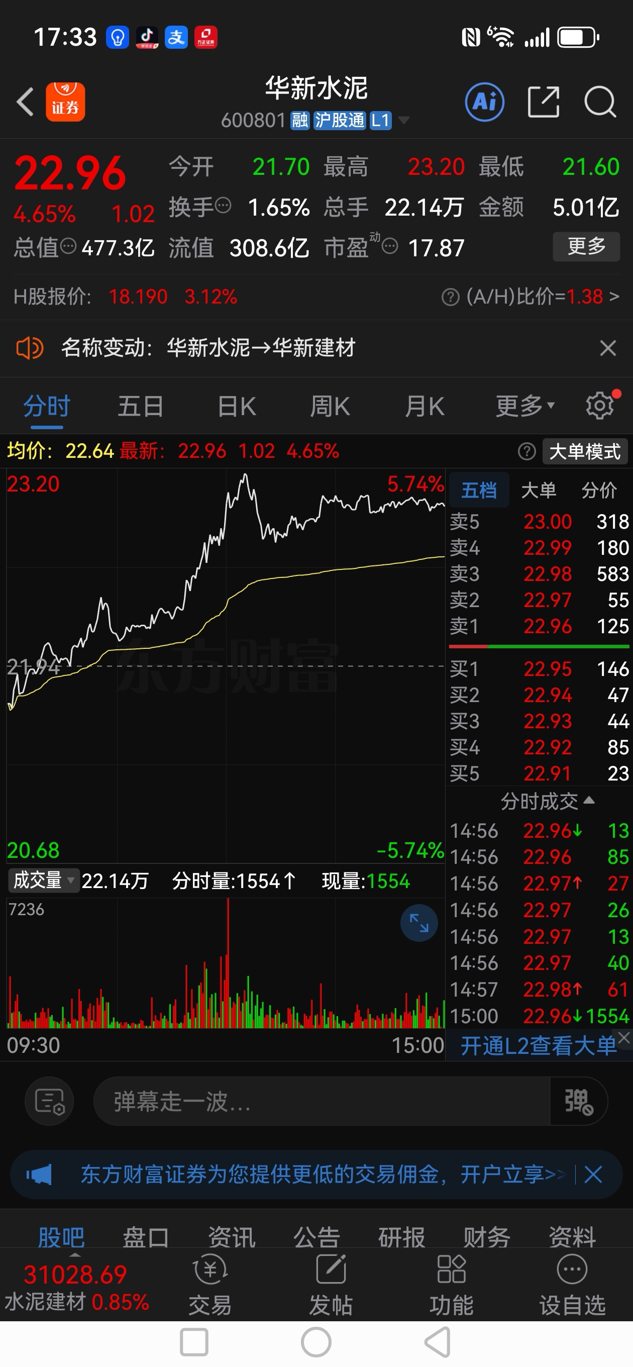 今天要不华新水泥大涨4.6%,上峰水泥必跌无疑,个人卖出剩于部分。由于华新水泥不