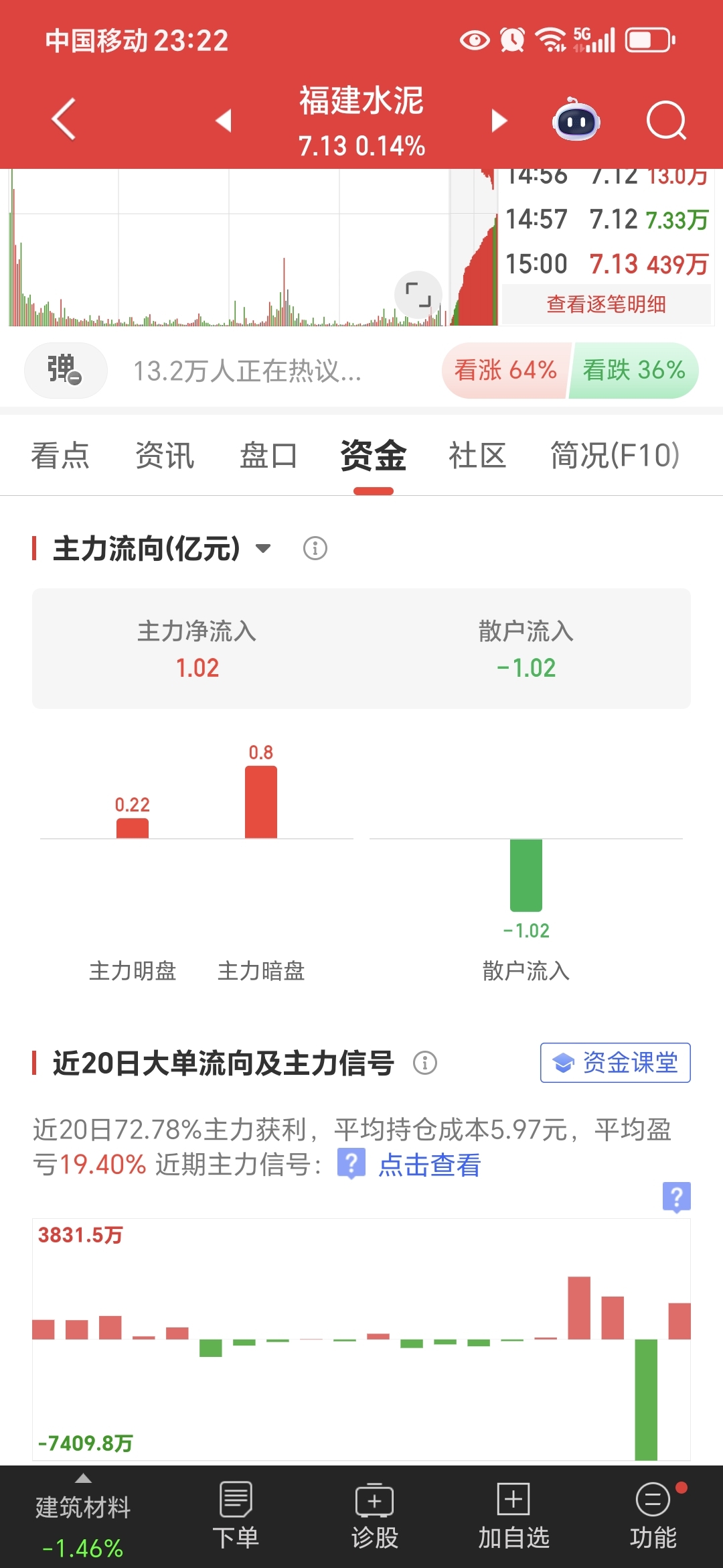 $福建水泥(SH600802)$ $福建水泥(600802)$ 散户走了一个亿,,明天红了