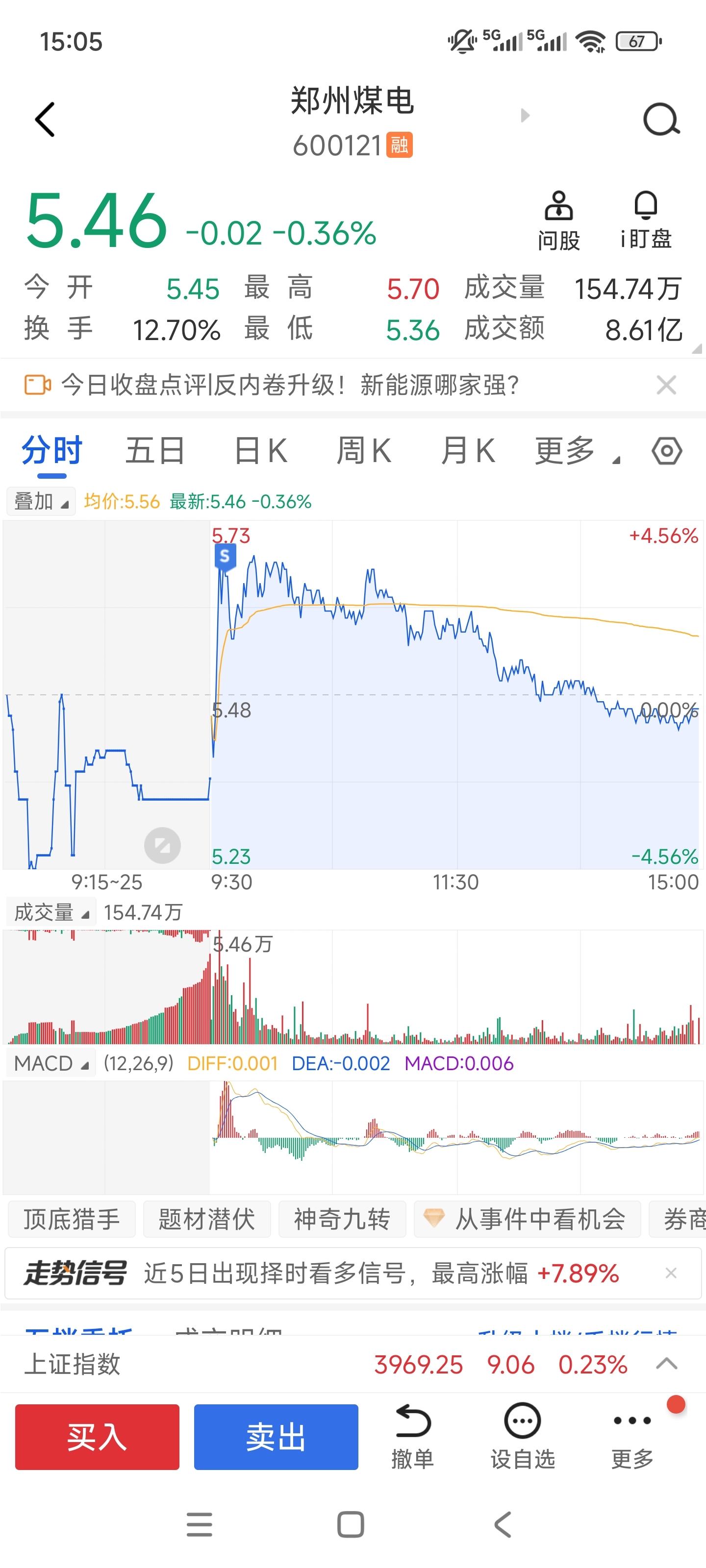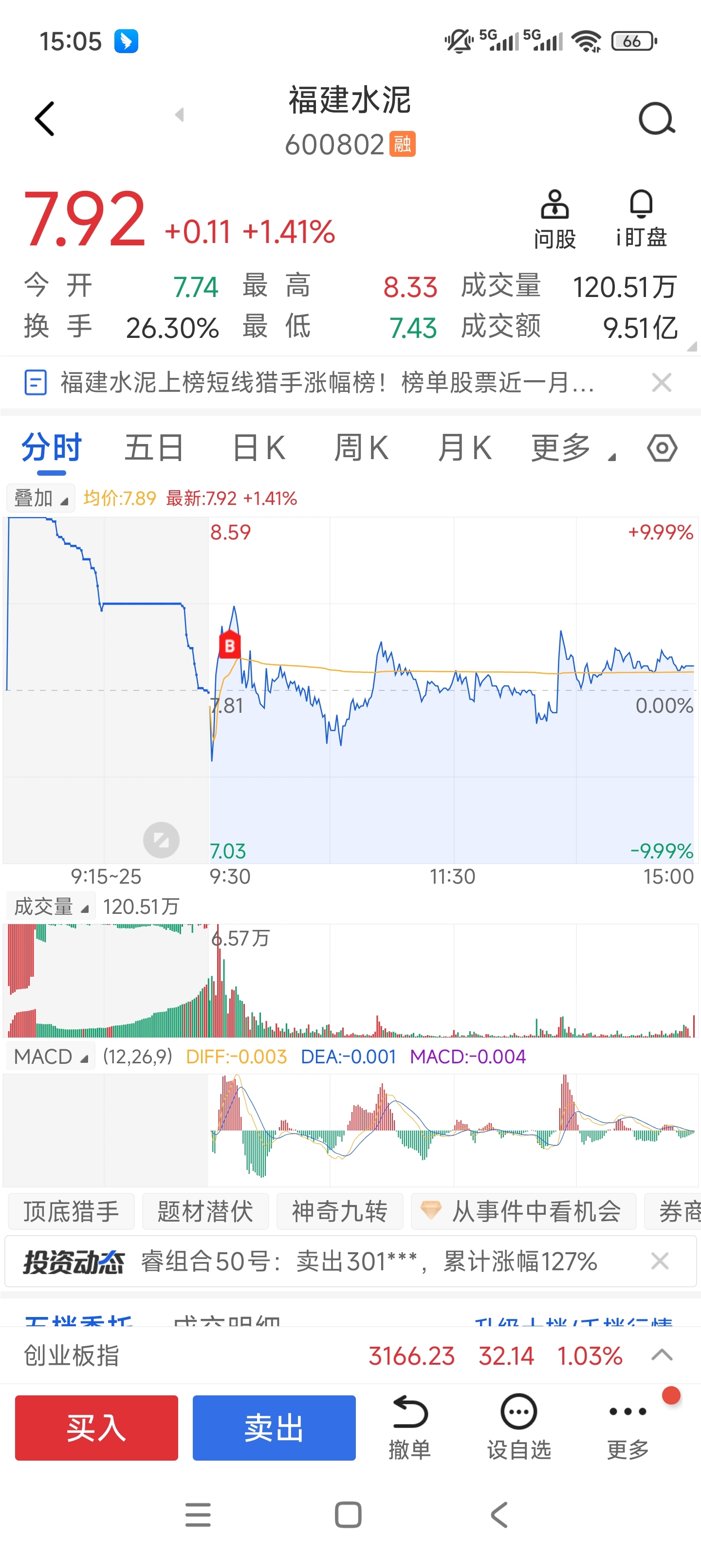 操作错了!早上郑州煤电拉高卖了,小肉。结果,追高了福建水泥(半仓),这一天走势,