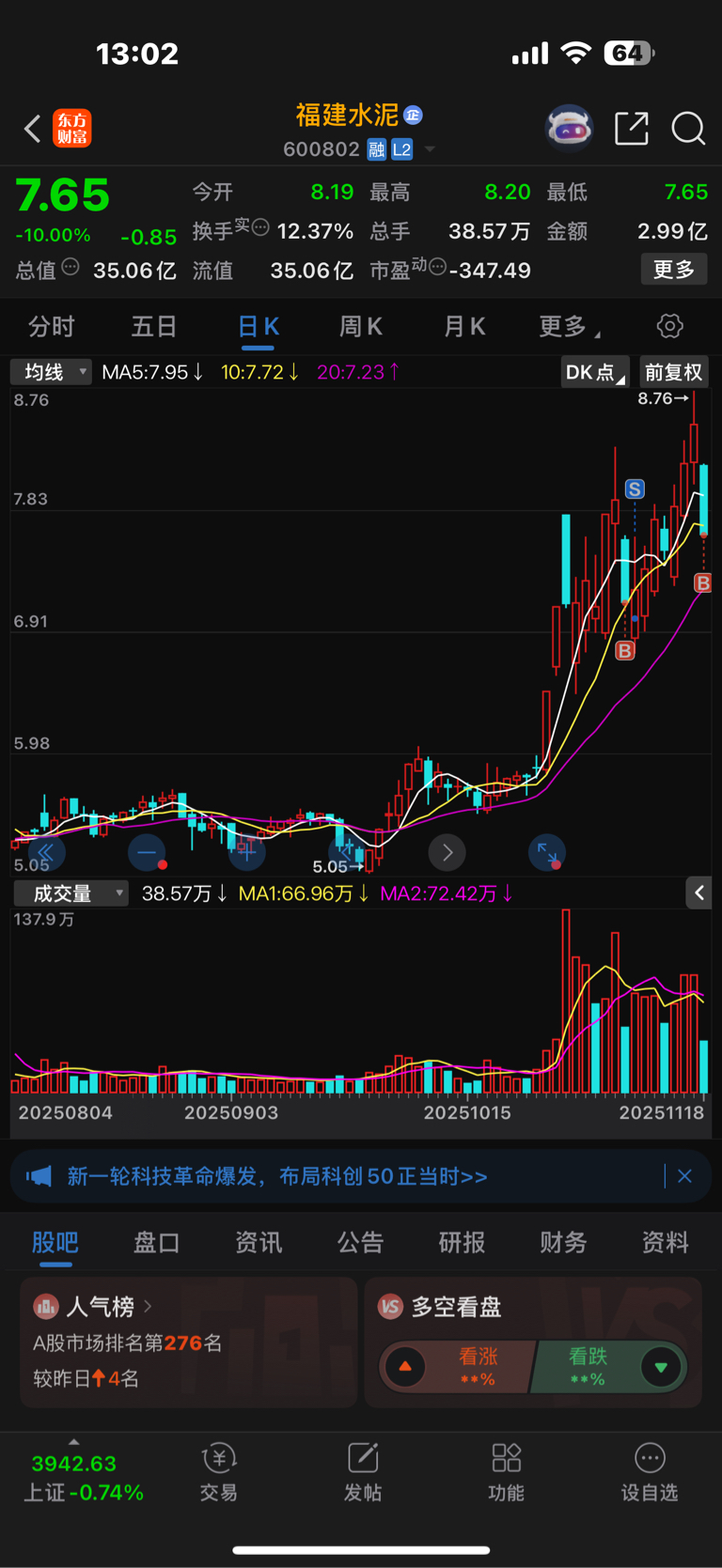 $福建水泥(SH600802)$ 不好意思被我买崩了,一买他就跌停
