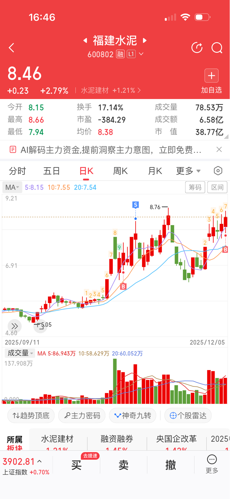 $福建水泥(SH600802)$ 今年的福建板块 真的室自己的幸运板块 如果没有平潭 没有漳州 今年的亏损 真的不可想象 周一水泥感觉小高开后直接砸下去