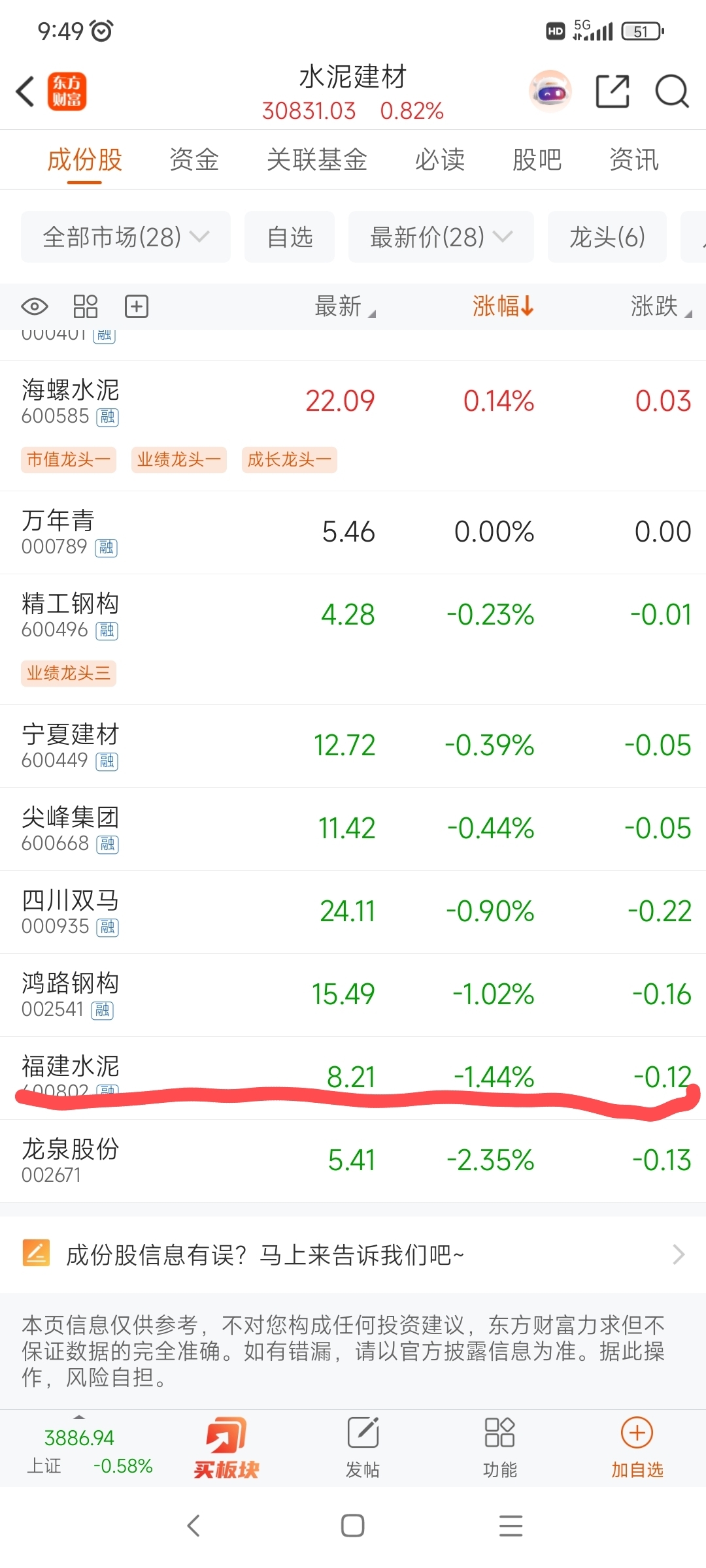 福建加水泥,两个板块都红,这货都倒数,估计完犊子了