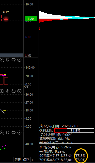 走势非常健康横有多长竖有多长底部7.95多次回踩,筹码集中度已经分别达到5.5和