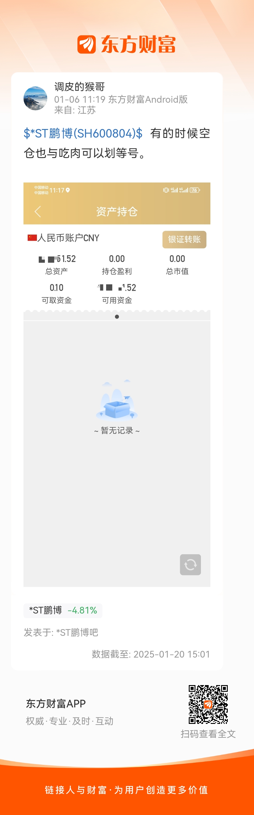 $*ST鹏博(SH600804)$  有的时候空仓也与吃肉可以划等号。
