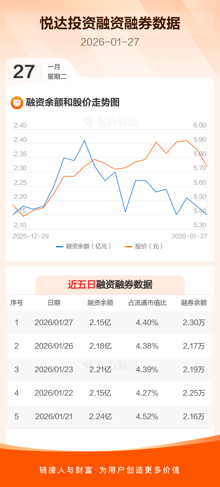 交易所最新数据显示,悦达投资于2026年1月27日获融资买入2530.25万元,融资偿还2892.39万元,当日融资净偿还362.14万元。目前,该股融资余额2.15亿,占流通市值比例为4.40%。