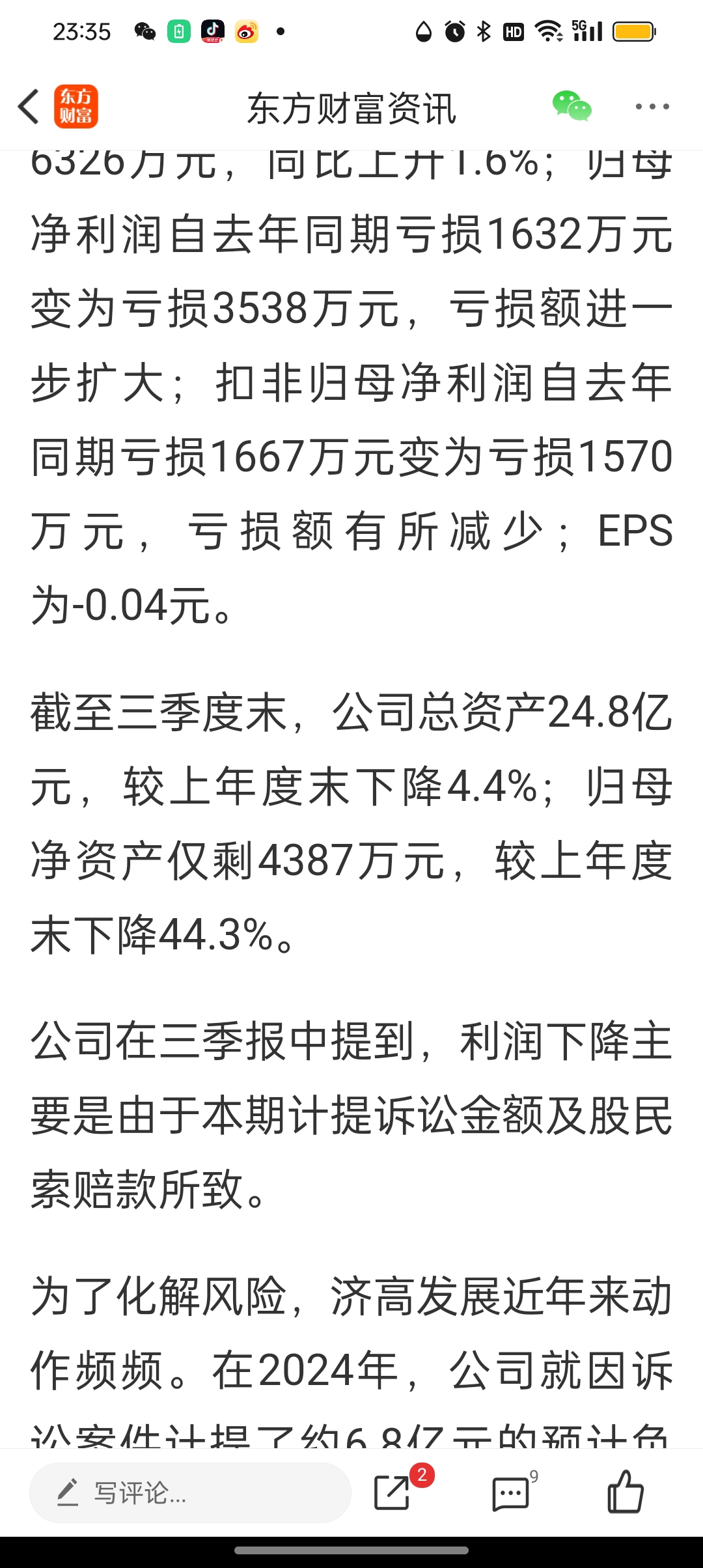24.8亿元总资产,净资产0.43+3.77=4.2亿元,到了这里才知道,公司还欠20.6亿元,24年计提了8亿元全部冲回来的可能性大不大?官司一判决了,控股股东支持的6亿元足够偿还的话,可以冲回来6亿元,上市公司还欠14.6亿元窟窿!
