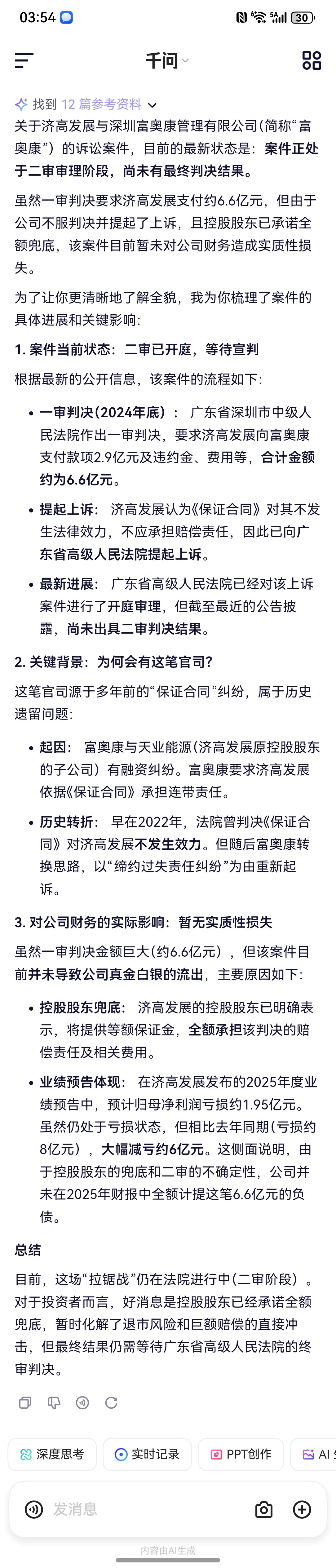 $济高发展(SH600807)$ 关于深圳富奥康管理有限公司的案件,“千问”是这样回复的。