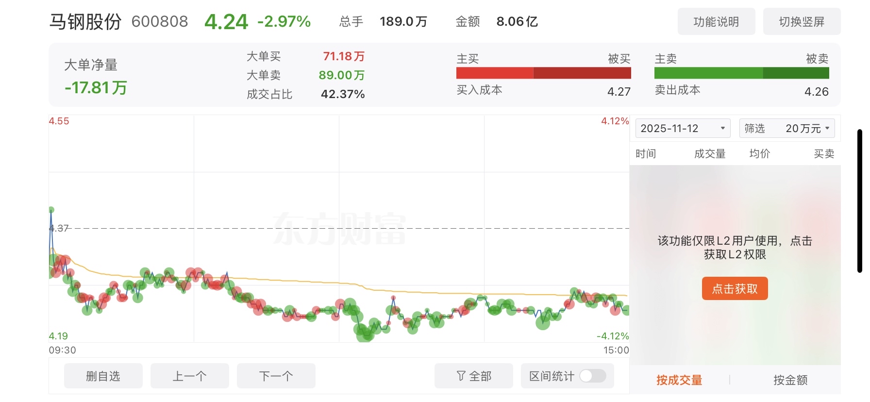 $马钢股份(SH600808)$ 看图分析,今天但凡有人买入,都会被砸,股价压得很稳,很难涨上去.#收盘点评#