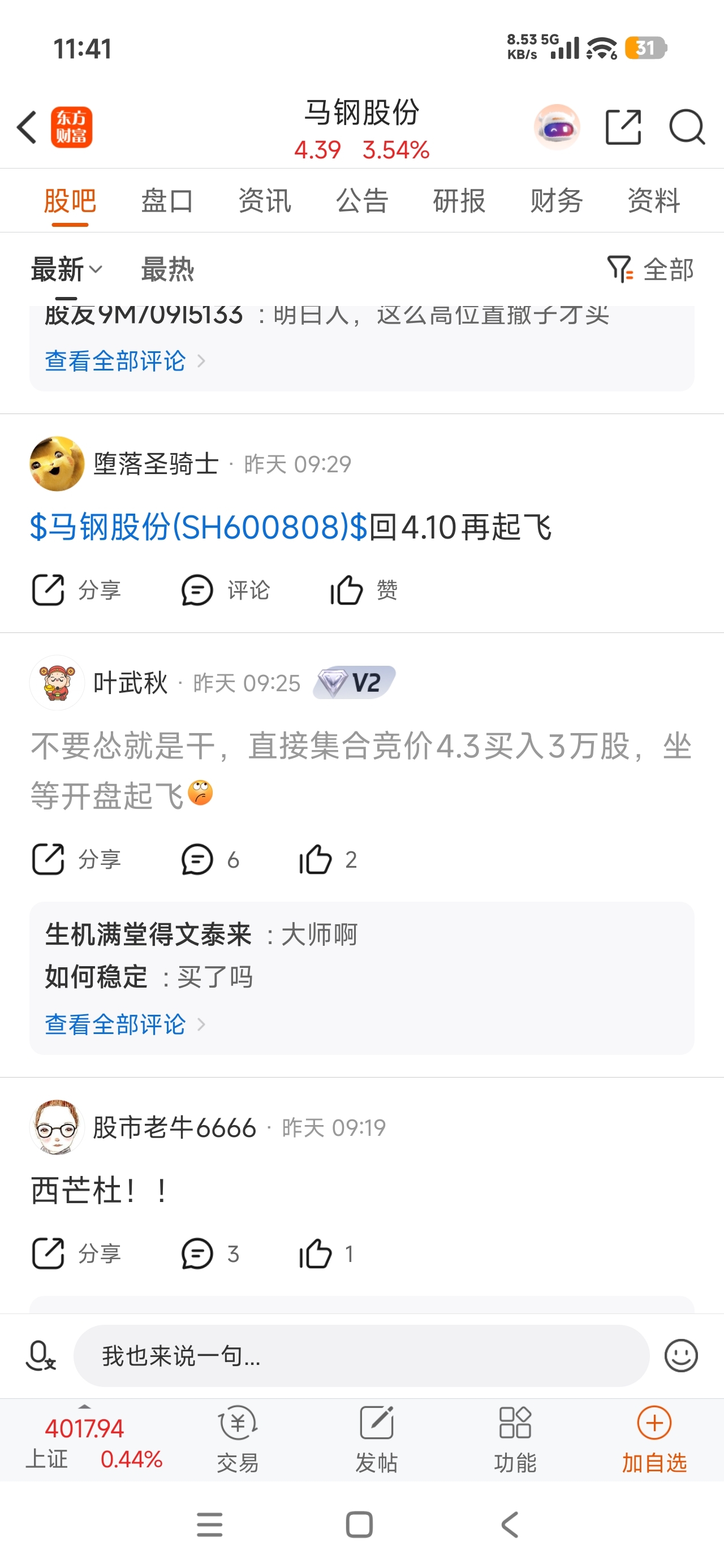 $马钢股份(SH600808)$ 真日了,昨天集合竞价4.3买了3万股,挨了一棍,今天早安没事干设置4.42清仓,本来就是闲着没事干挂着看看的,结果居然成交了,这下要不要接回来犹豫了