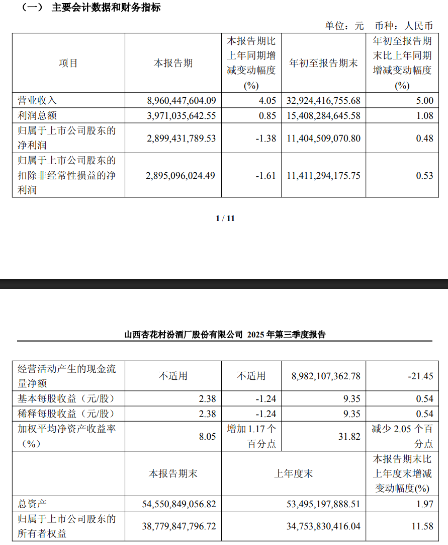10月30日,山西杏花村汾酒厂股份有限公司(山西汾酒,600809.SH)披露2025年第三季度报告,公司前三季度实现营业收入329.24亿元,同比增长5.00%;归母净利润为114.05亿元,同比增长0.48%。