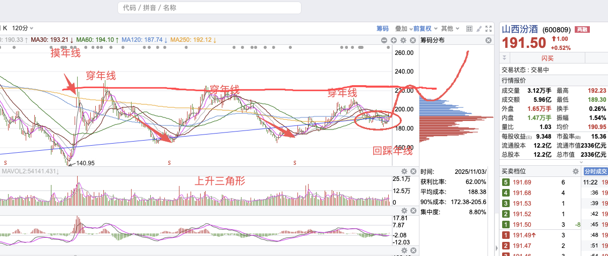 此股基本适用年线战法,目前上升三角形,这里如果年线能站稳则上升趋势开启。另外白水