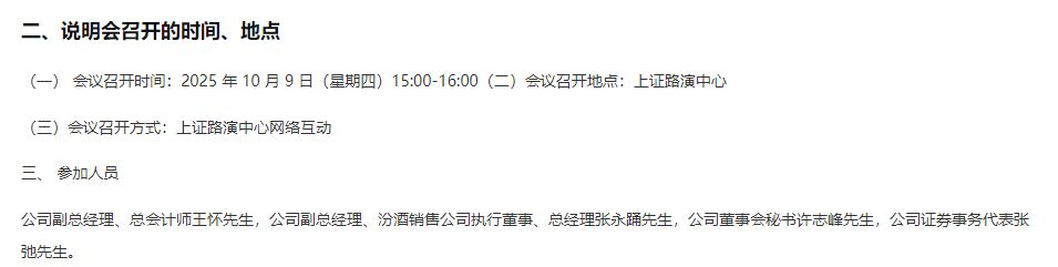 公司发布的《关于召开2025年第三季度业绩说明会公告》显示,参会管理层包括公司副总经理、总会计师王怀,公司副总经理、汾酒销售公司党委书记、董事长张永踊,公司董事会秘书许志峰,公司证券事务代表张弛。
