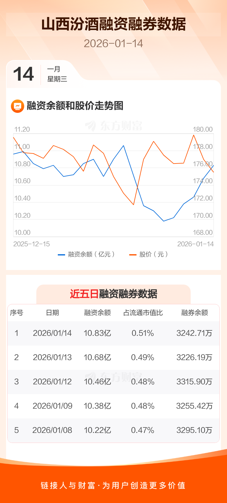 交易所最新数据显示,山西汾酒于2026年1月14日获融资买入8830.68万元,融资偿还7382.56万元,当日融资净买入1448.12万元。目前,该股融资余额10.83亿,占流通市值比例为0.51%。
