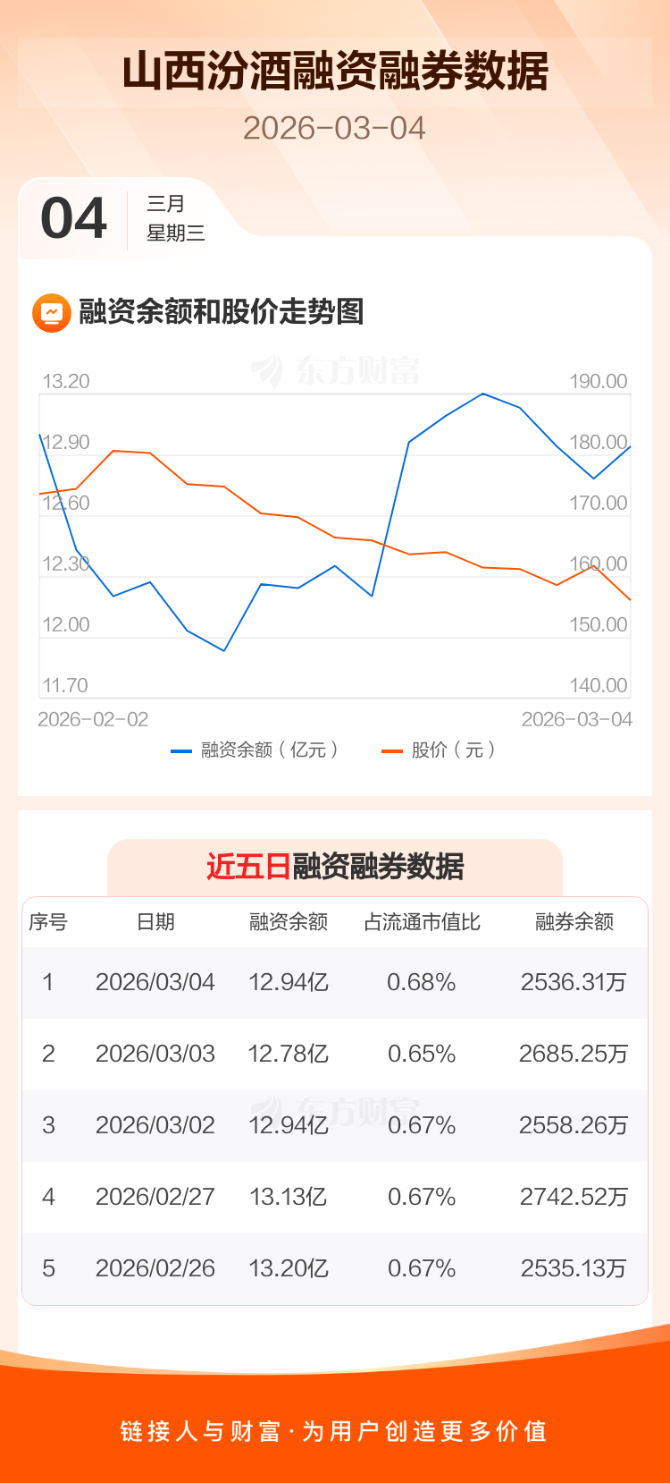 交易所最新数据显示,山西汾酒于2026年3月4日获融资买入7012.94万元,融资偿还5387.77万元,当日融资净买入1625.16万元。目前,该股融资余额12.94亿,占流通市值比例为0.68%。