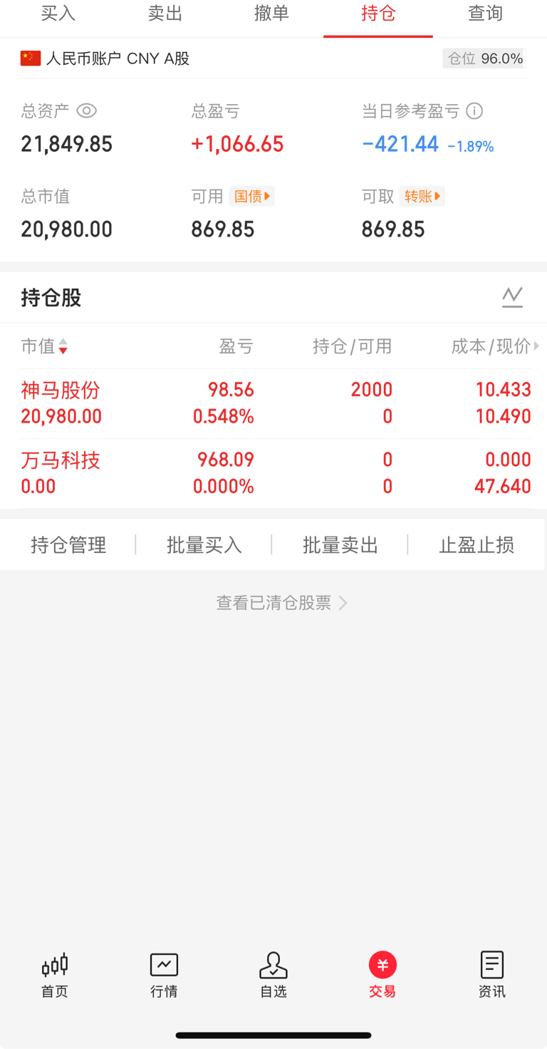 $神马股份(SH600810)$ 挑战200天亏完2万——实盘第5天