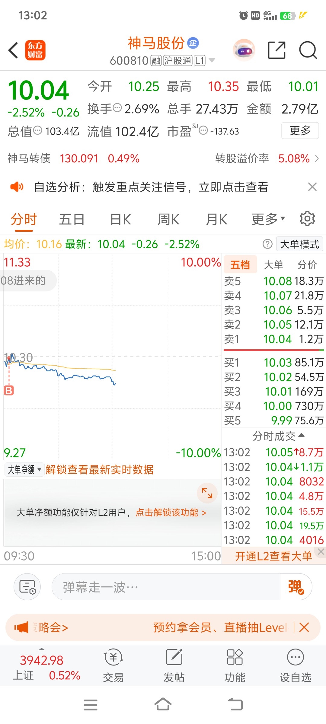 $神马股份(SH600810)$ 开盘看着要拉进来就挨打