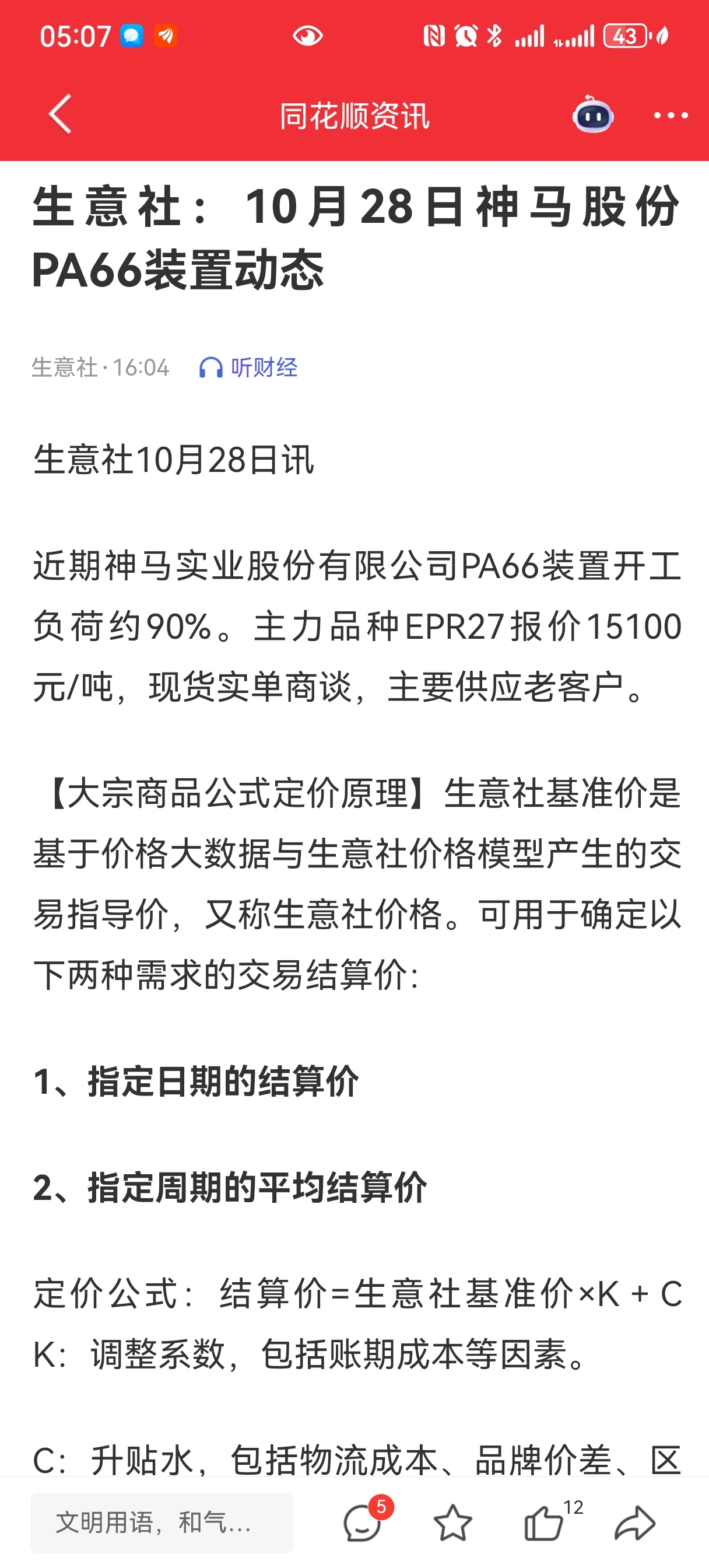 $神马股份(SH600810)$ 今天应该跑的.价格又跌了这么多