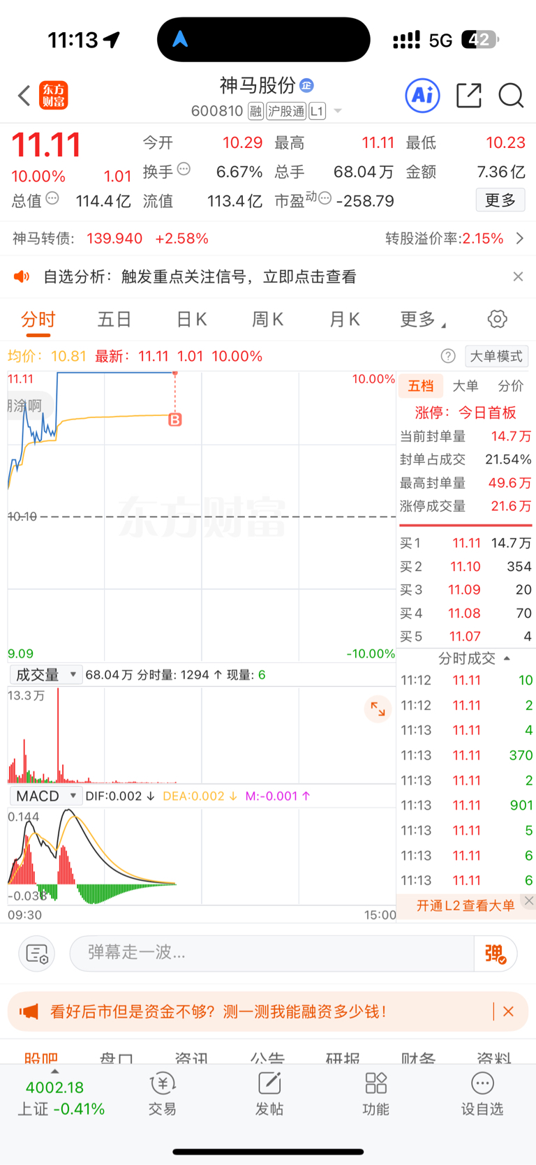 $神马股份(SH600810)$ 涨停第二秒排队进去了,感谢