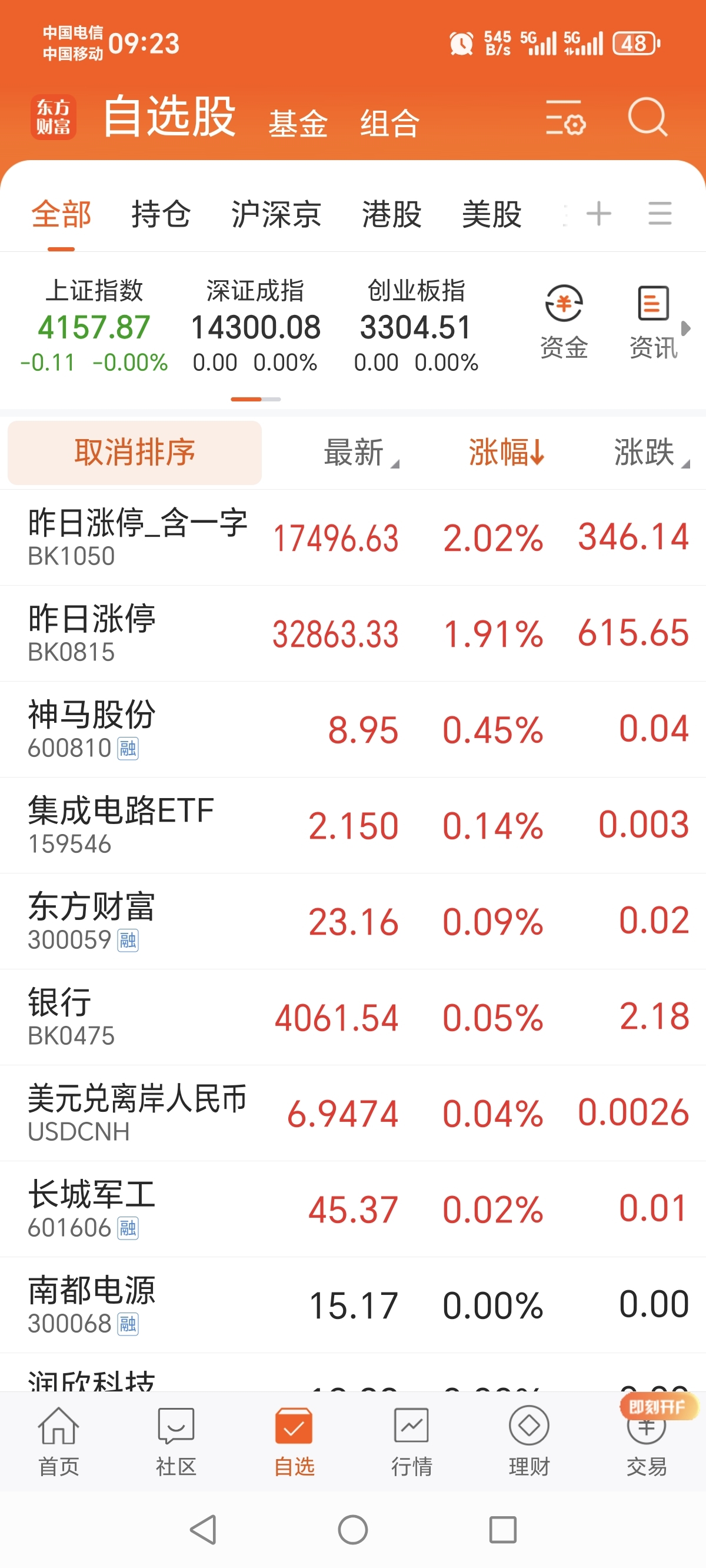 自选股里面涨幅排名第一