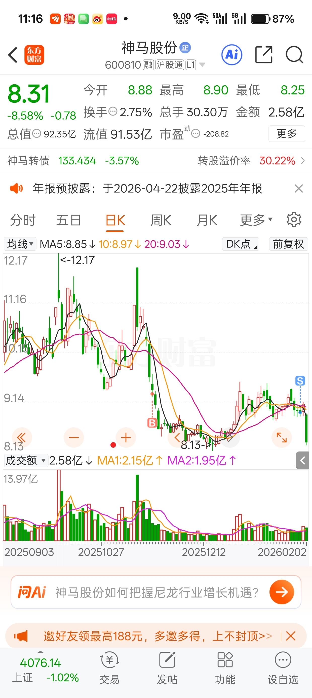 $神马股份(SH600810)$ 幸好逃得快,亏本逃