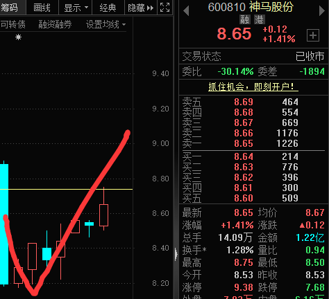 神马股份 黄线(庄家成本线),自救回血,触线回血,卖出了结。