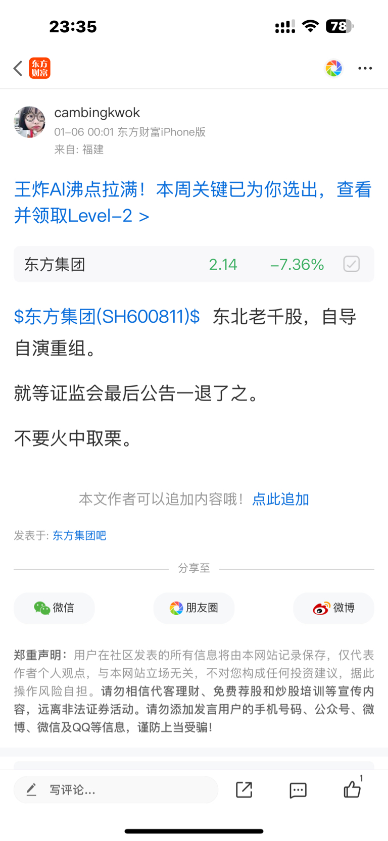 温馨提示: 1.根据《证券法》规定,禁止编造、传播虚假信息或者误导性信息,扰乱证券市场;2.用户在本社区发表的所有资料、言论等仅代表个人观点,与本网站立场无关,不对您构成任何投资建议。用户应基于自己的独立判断,自行决定证券投资并承担相应风险。《东方财富社区管理规定》