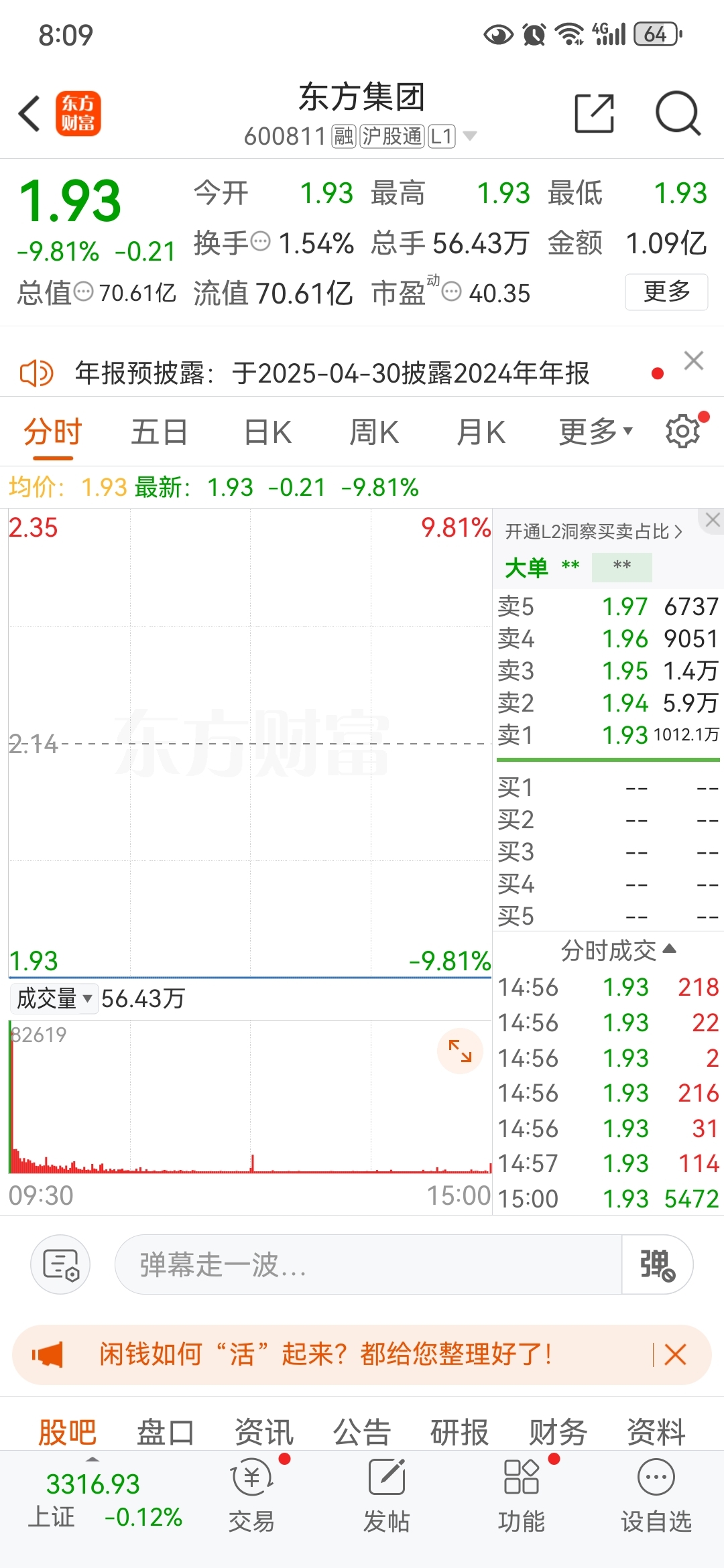 $东方集团(SH600811)$ 别说跑的问题了,10亿股封单怎么跑?大家没注意的是第一个跌停居然还买了1亿资金?这些机构真是不把别人的钱当钱用