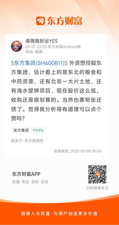 $东方集团(SH600811)$ 外资想控股东方集团,估计看上的是东北的粮食和中药资源,还有北京一大片土地,还有海水提钾项目,现在股价这么低,收购还是很划算的。当然也要帮张还债了。觉得我分析得有道理可以点个赞吗?