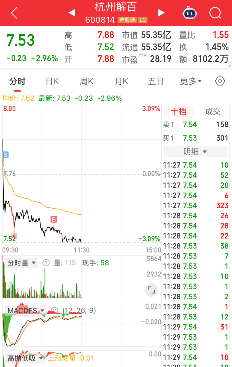 $杭州解百(SH600814)$ T早了,又跌了3分