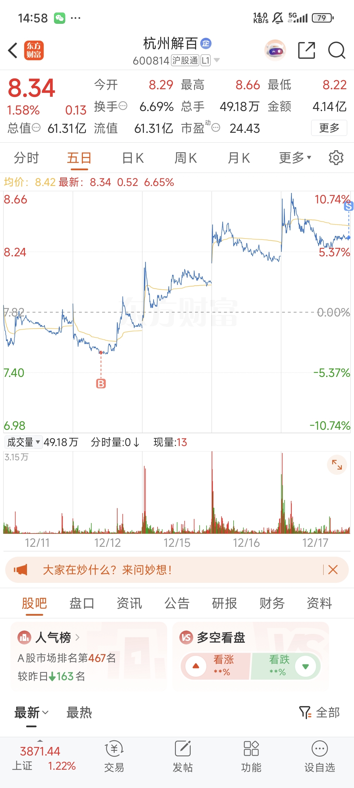 $杭州解百(SH600814)$ 一而再再而三的冲不上去,走了,发帖留念一下。只挣认知范围的钱。