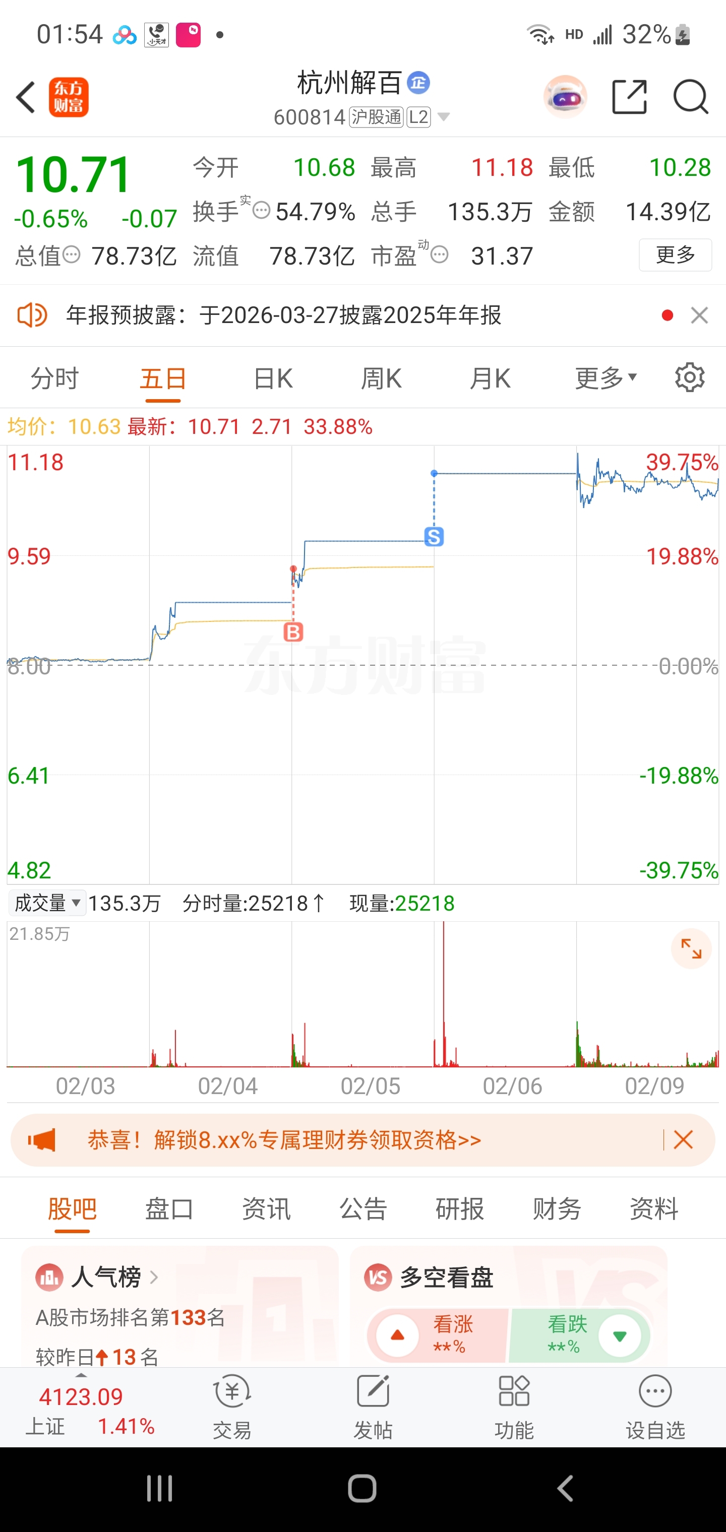 $杭州解百(SH600814)$ 杭州解百昨天集合竞价就卖了,开盘一看是一字板,后悔不已,今天开盘一看,哎呀我的妈,还有这事儿!京投发展昨天集合竞价也卖了,跌下去又买回来,结果没起来一路下跌,我以为今天要地板,结果今天反包涨停!你看这事儿闹的,能不能让人省点心啊!各位大神,你们能够判断涨停次日是继续吃肉还是大面一碗吗?开盘急跌,怎么判断会反弹起来还是会阴跌洗盘?