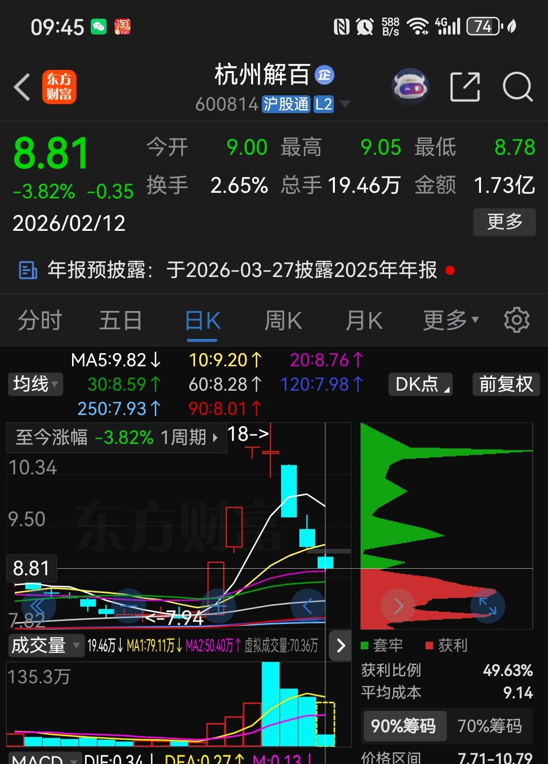 $杭州解百(SH600814)$ 看筹码分布,底部筹码还在