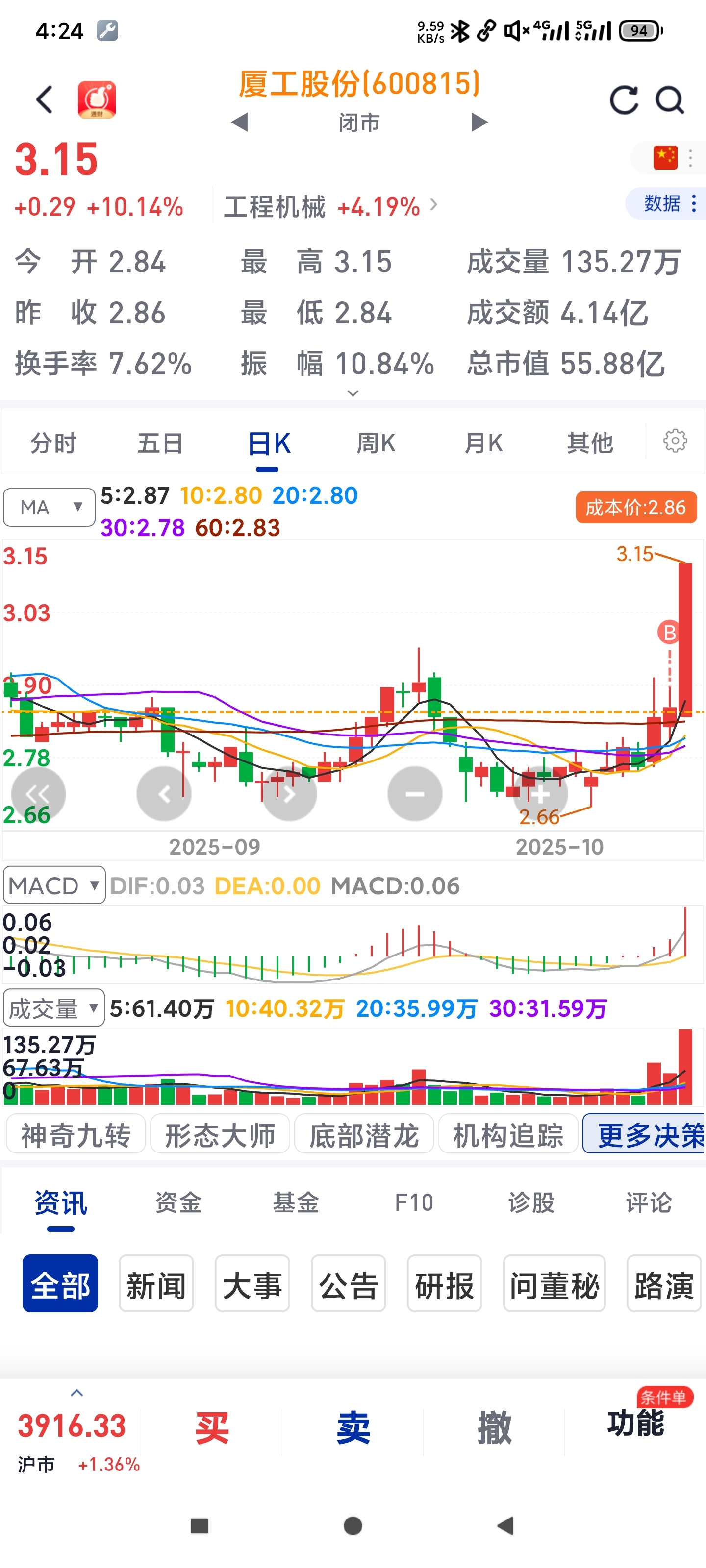 $厦工股份(SH600815)$ 哈哈,刚来第二天就吃到涨停,不错不错