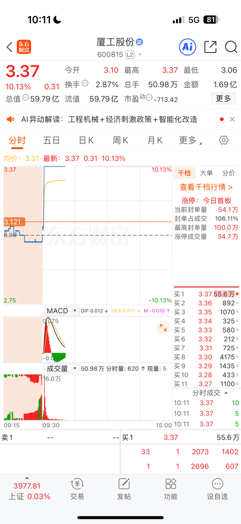 $厦工股份(SH600815)$ 昨天进了,关注我每天复盘思路哦