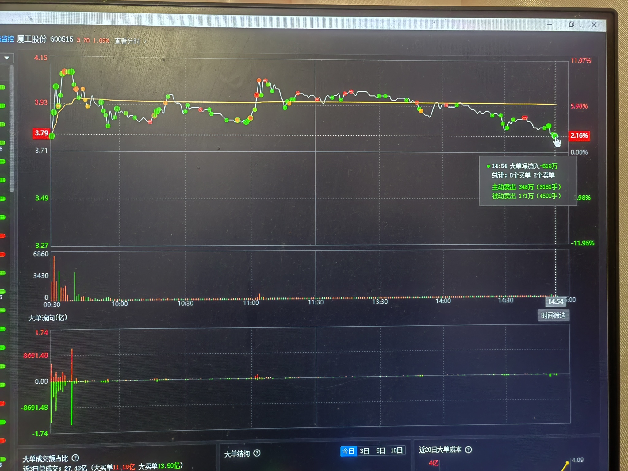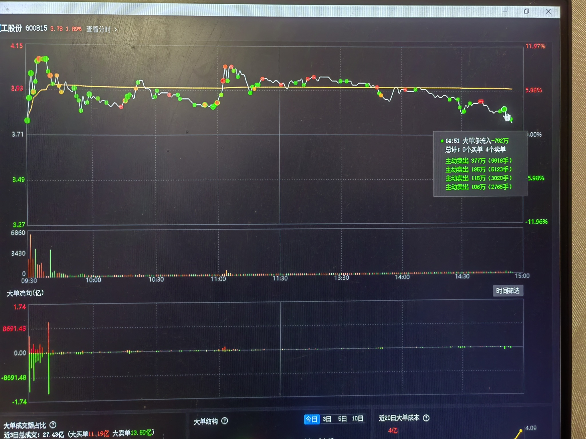 希望晚上有龙虎榜…开板后全天都在砸,每一个分时的关键位就有人砸,尤其是尾盘砸恐慌