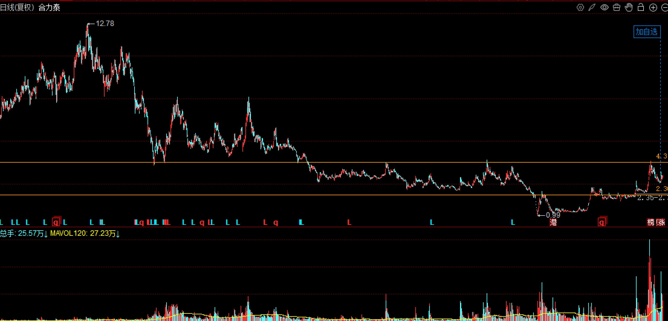 合力泰,前面一直想说的票。以消息操盘建仓的票,标准的强庄股。庄家成本2.3,前面有过一波行情。但是这里虽然有空间,但是还是不足以完成一行情,这里还是属于震仓动作,不过空间大了点。还是上图,清晰明了!精准操盘打到前面的平台,就是要去释放前面的压力,市值不小,庄家志存高远。不可能在明知道前面有平台压力的情况下去出货的,空间远远不够。再继续观察中。