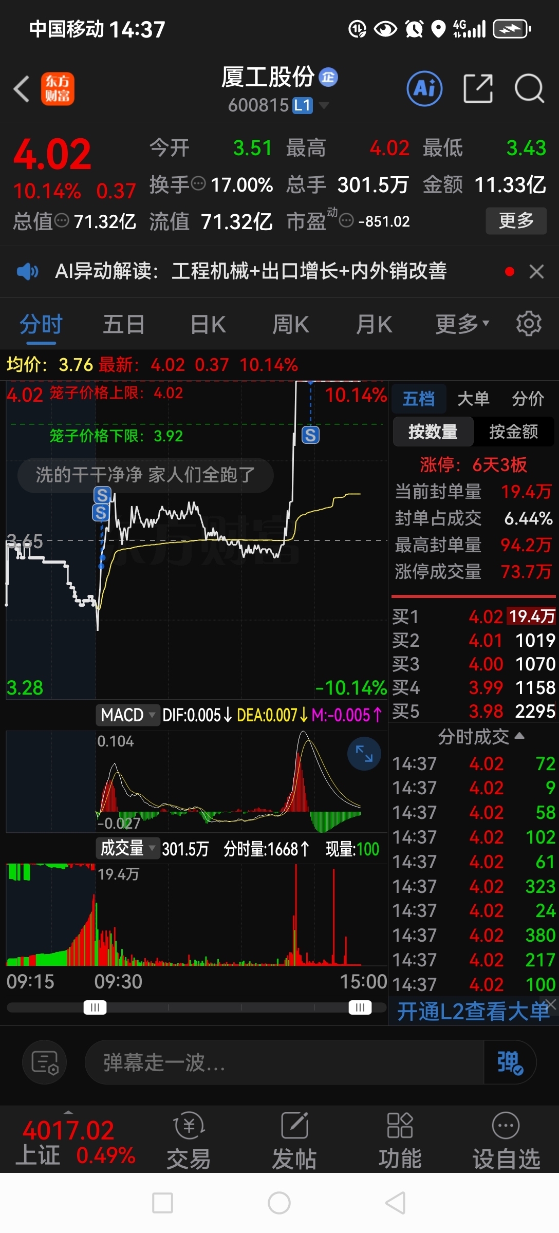 $厦工股份(SH600815)$ 全卖完了。 但我估计明天早上还会冲一把。