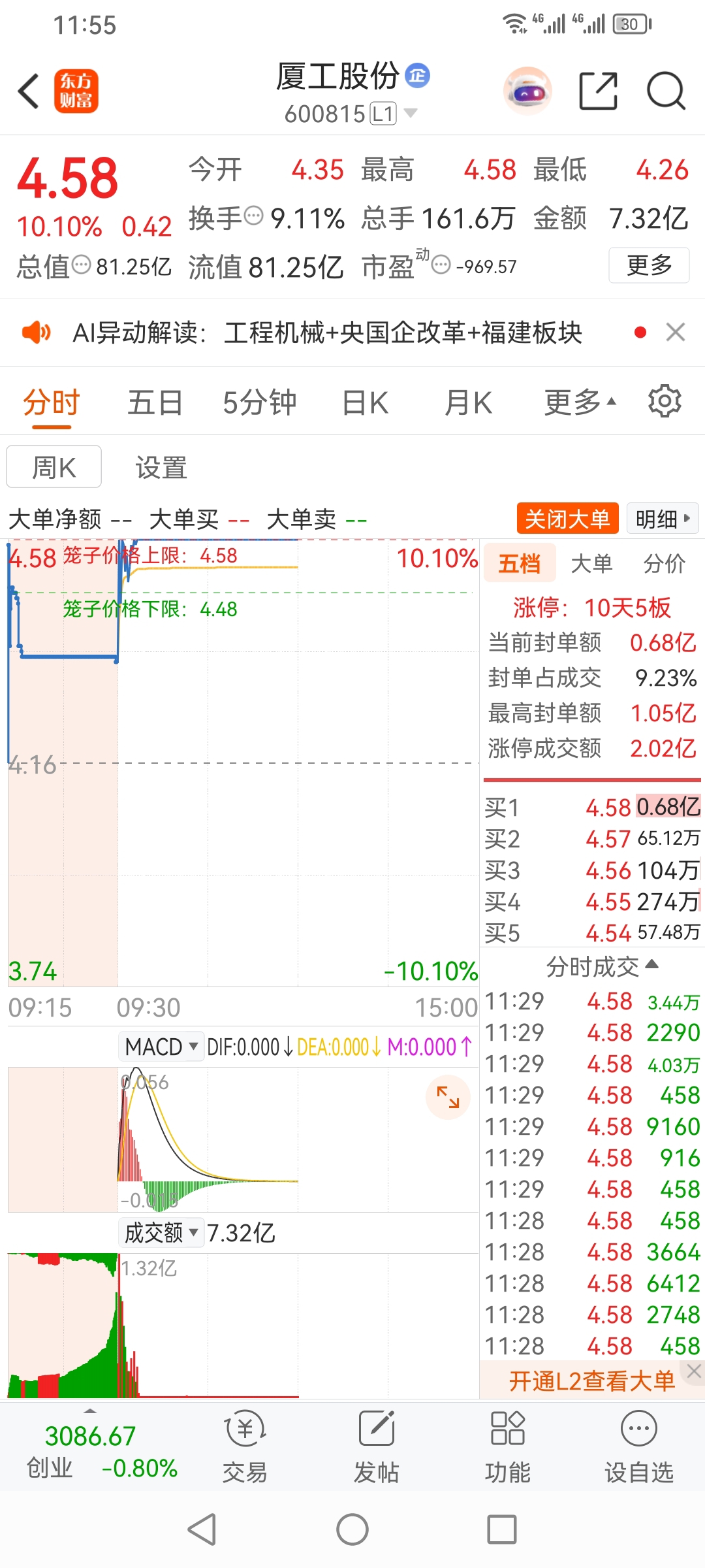 方军,今天操盘厦工股份,放量涨停板。看好买进。