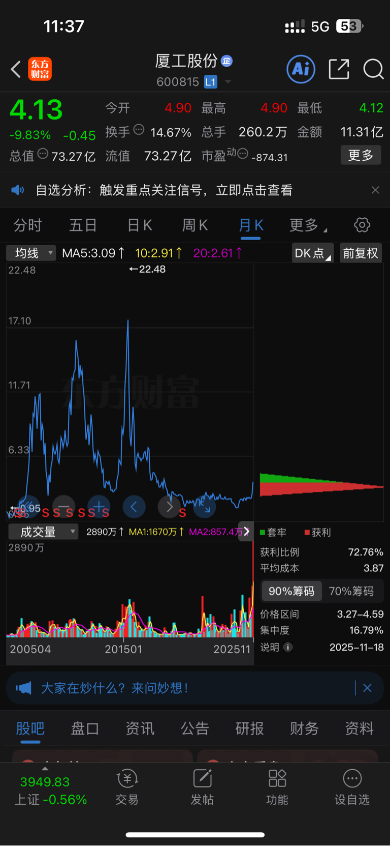 $厦工股份(SH600815)$ 历史以来最大量,价格才最高价格的20%哪位大佬来讲解一下。