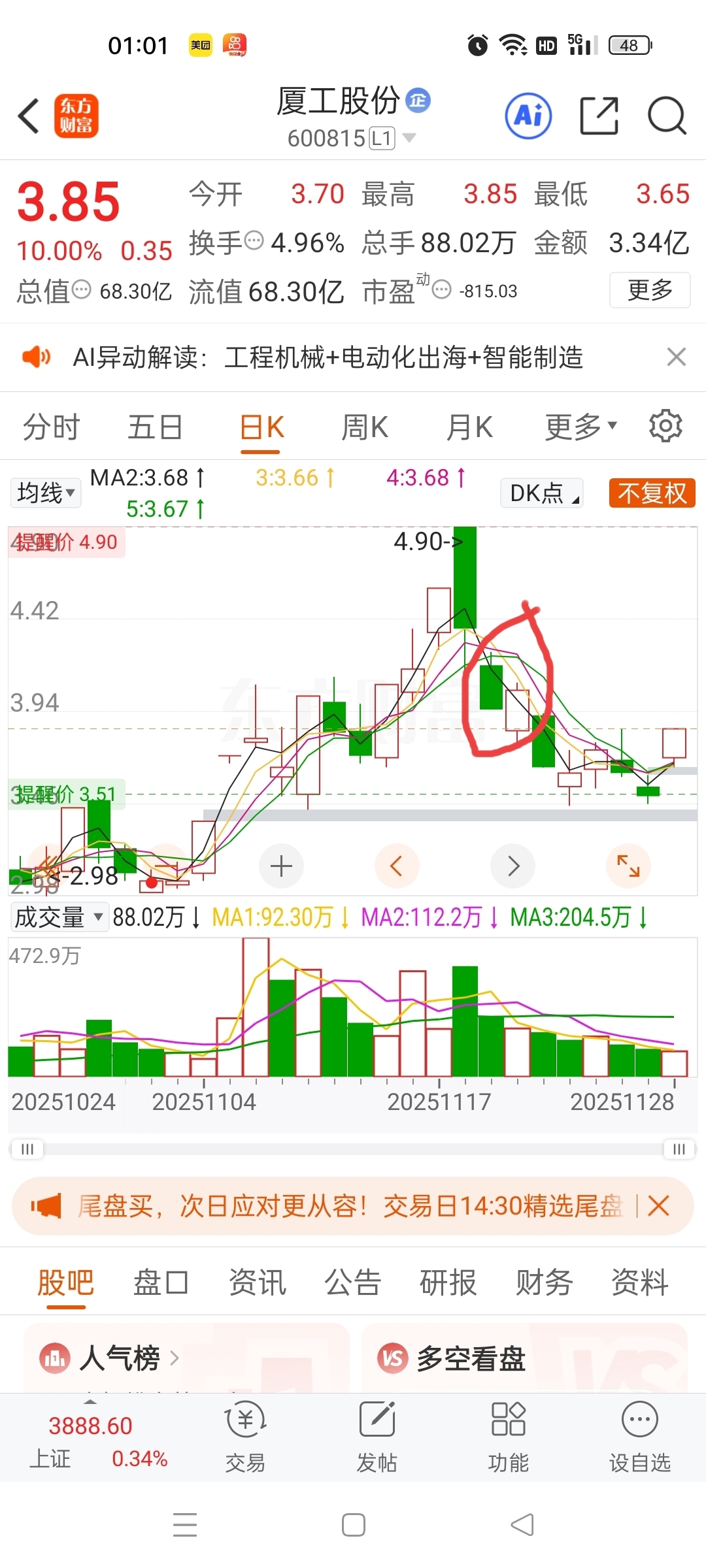 $厦工股份(SH600815)$ 还有这一天低开有其它资金抄底,第二天主力走了个阳线让他成本出来,后面一直压盘没有人进来搞事,把小散筹码吃掉