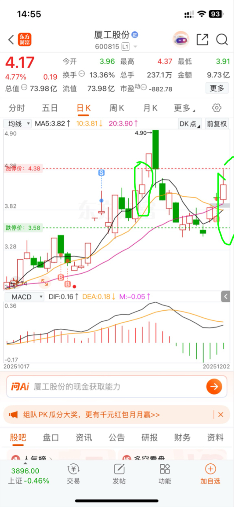 $厦工股份(SH600815)$ 跟这天一样,高点都是4.37,收盘价也基本上一样,第二天高开秒板