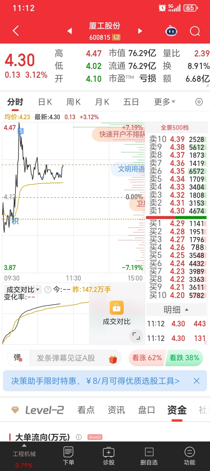 $厦工股份(SH600815)$ 昨天格局没卖,早上低开差点卖了,拉起来立刻卖了,不然亏钱了