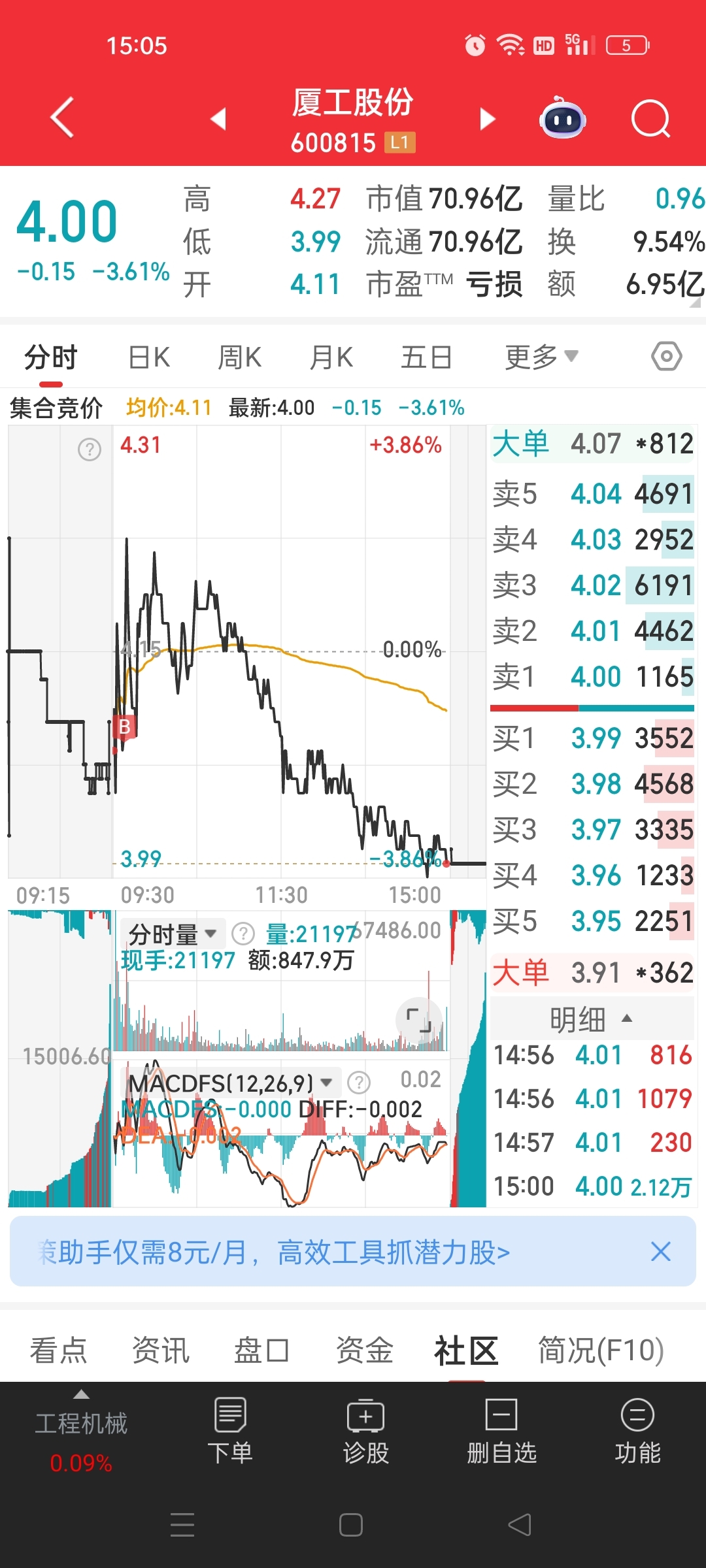$厦工股份(SH600815)$ 早上4.08买一笔,尾盘接一笔,坚持看多