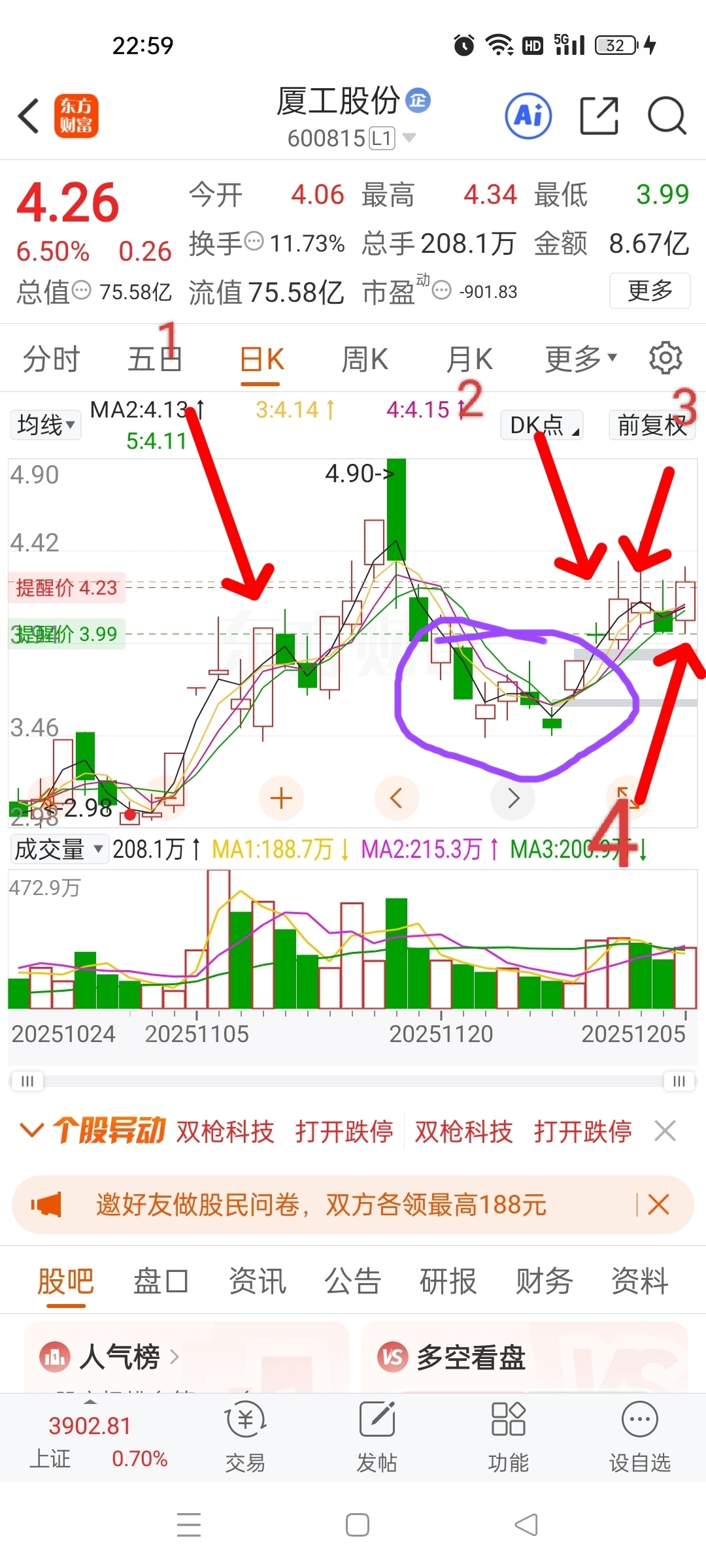 $厦工股份(SH600815)$ 1控盘筹码圈圈吸筹,2抬轿子打套牢盘,3主力护盘抬轿子盈利逐步退出,4主力补量游资跟进,上影线全部散户接套牢盘抛压,割肉的亏钱