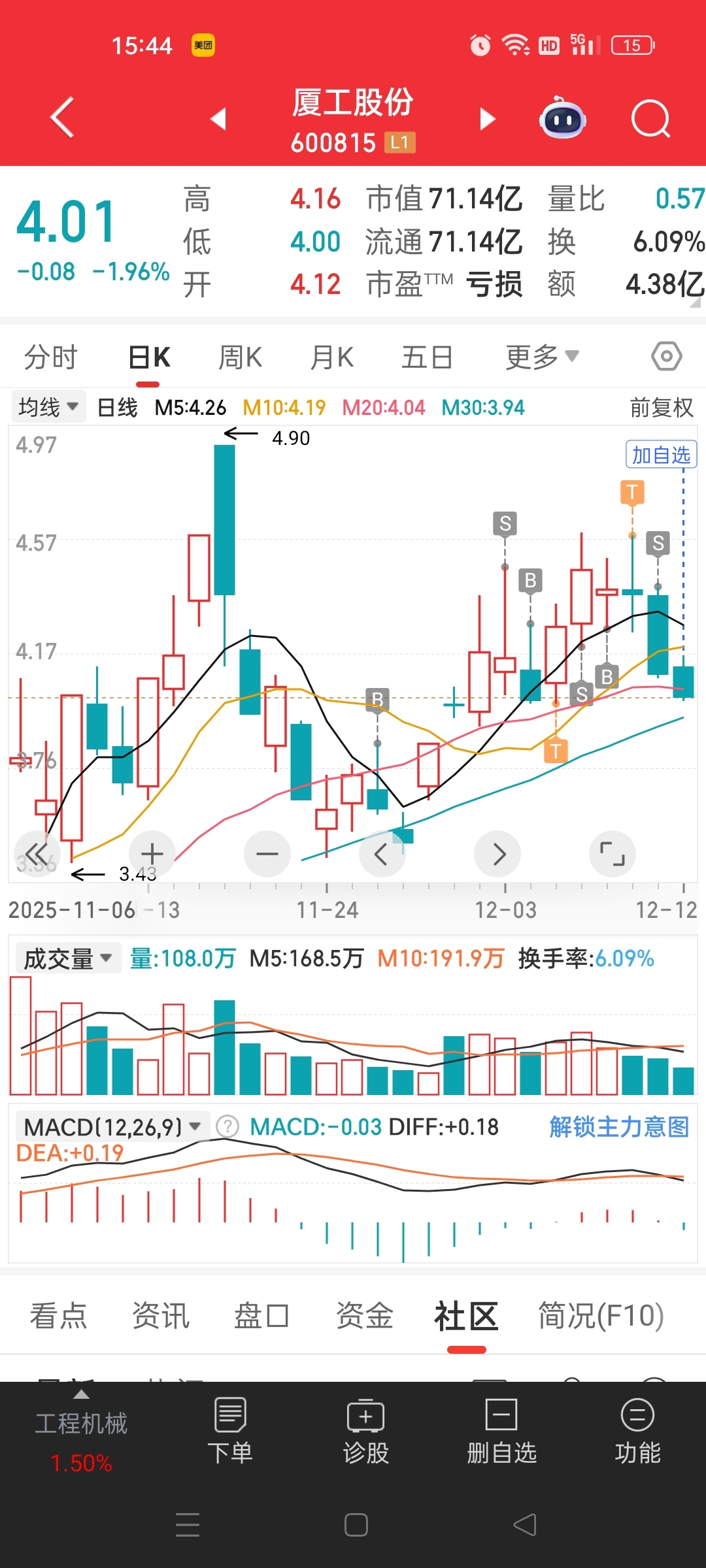 $厦工股份(SH600815)$ 厦工股份关键点位置应该加速的它拉夸直接清仓了,去外面也被毒打一次,阴线均价4.41一个坎几天没突破,长线下面涨停上面应该可以